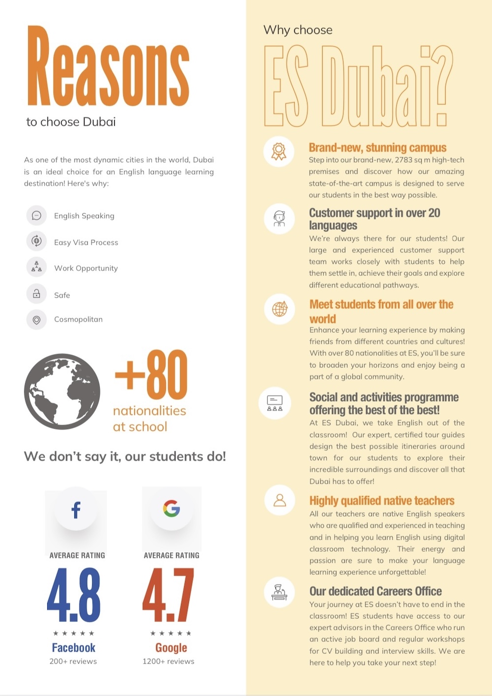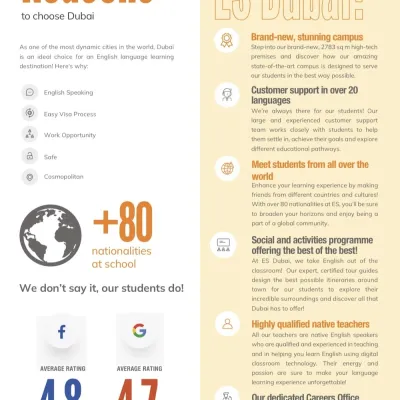 Pýšime sa exkluzívnou spoluprácou s jazykovou školou ES Dubai. Jazyková škola aktuálne pokrýva výučbu približne 5000 študentov z rôznych kútov sveta, lektori sú native, držitelia TESOL, CELTA či iných známych certifikácií.
